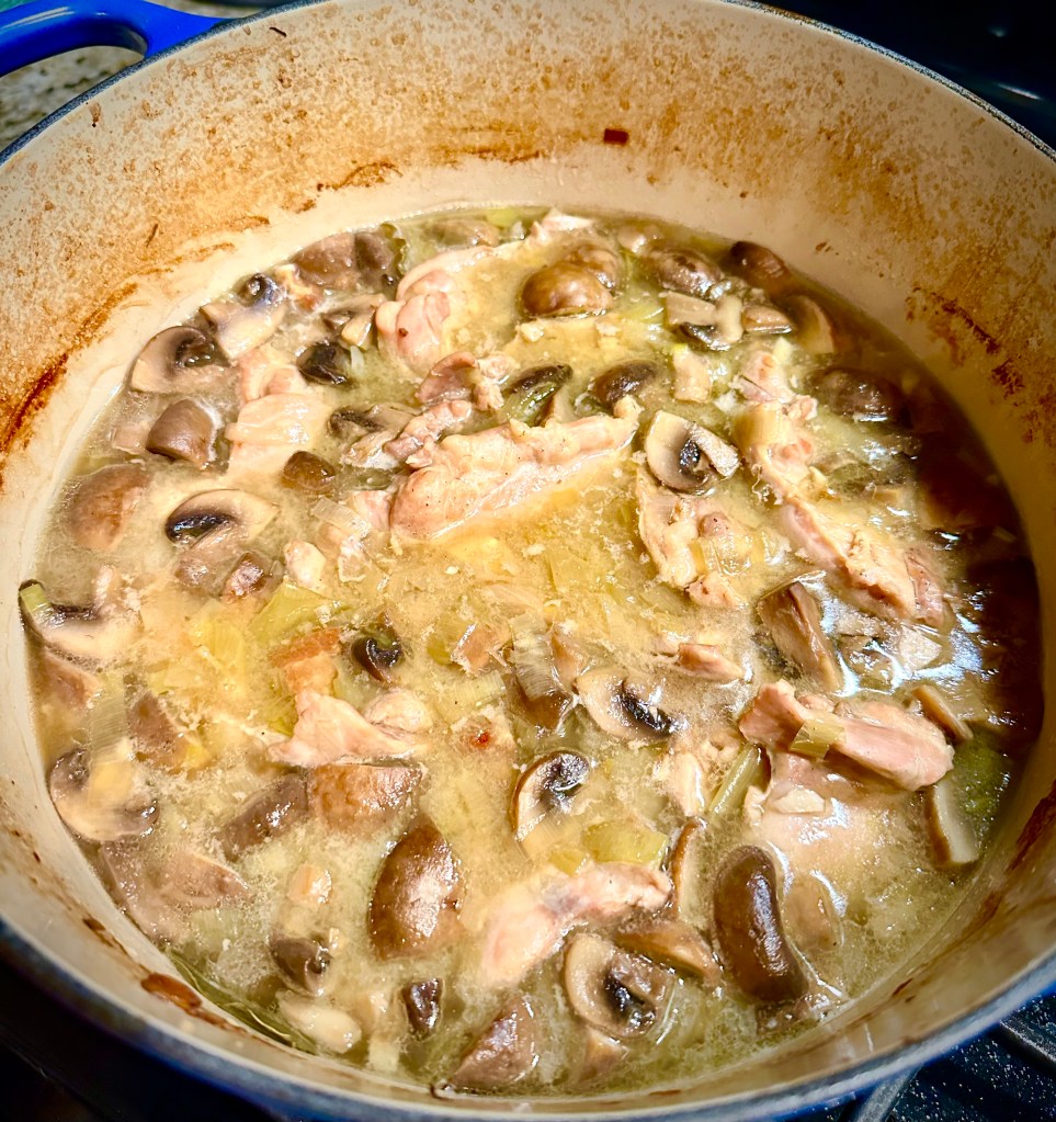 Now add back the browned chicken and pour in the cognac and cook until the alcohol is gone, and then add the thyme, bay leaves, cooked bacon, mushrooms and wine. Bring to a boil and put into the oven covered for 2 hours.