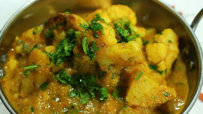 Add the sugar, curry paste and cook briefly. Then add cauliflower, potatoes and mix well and sauté briefly. Then add tomatoes, bring to a soft boil and simmer covered for 45- 1 hour.