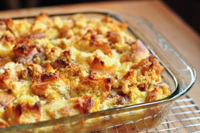 Beat together the eggs, extra yolks, then add the milk, heavy cream, bourbon, vanilla extract, nutmeg and finally the sugar and combine. Pour this mixture over the croissants and push down with a fork. Cover and refrigerate for 12-24 hours.