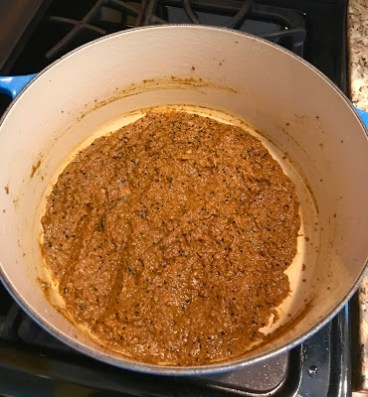 While the onion puree mixture is sautéing, grind all of the roasted whole spices into a fine powder. Add in the second group of ground spices and then add all to the onion puree mixture and gently sauté. Do not let it burn. If it seems dry, add a little water.