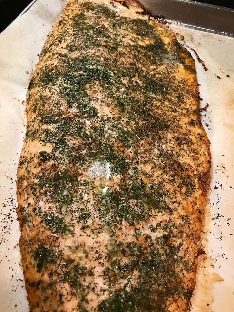 Melt your butter and brush it onto the salmon filet. Sprinkle on your spices to taste and bake for 10-15 minutes, depending on the thickness of the salmon. Remove and allow it to rest for 3 minutes before serving. It goes well with the seafood rice pilaf I featured in an earlier post.