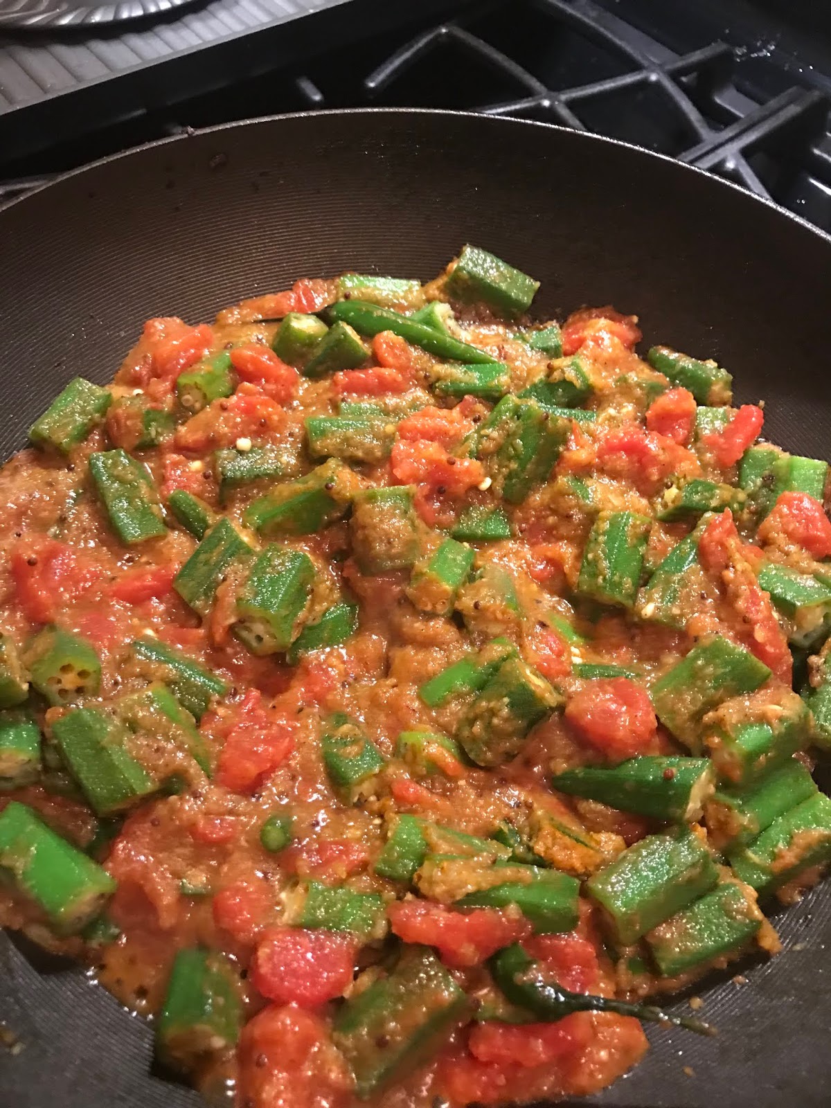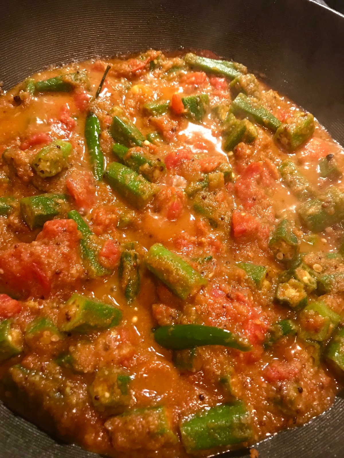 There are so many recipes for this dish, but basically they all have a few commonalities. Onion, ginger and garlic purée and tomato base with additional ground spices. The names okra, bhindi and lady fingers are used interchangeably.