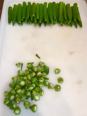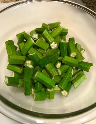 Prep the okra by washing them throughly and drying them completely. Cut off each end and then cut them into bite size pieces. I could have cut my pieces slightly smaller.