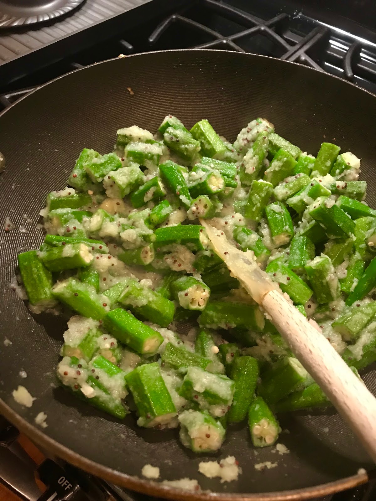 Add the oil to your pan and add the black mustard or cumin seeds. Once they start popping, add your onion, garlic and ginger purée and allow it to turn slightly golden brown. Add the chili powder, turmeric and garam masala and salt and sauté for a minute or so to take off any rawness of the spices. Add the okra and the lemon juice and cook for 6-8 minutes.