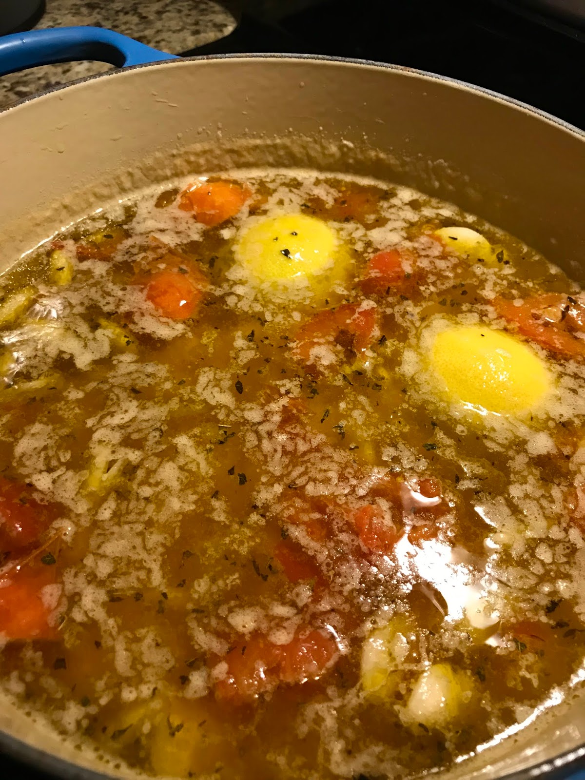 Then add in the preserved tomatoes and browned lemon halves and some additional salt. Add the rest of the thyme and oregano. Cook for 2 hours.