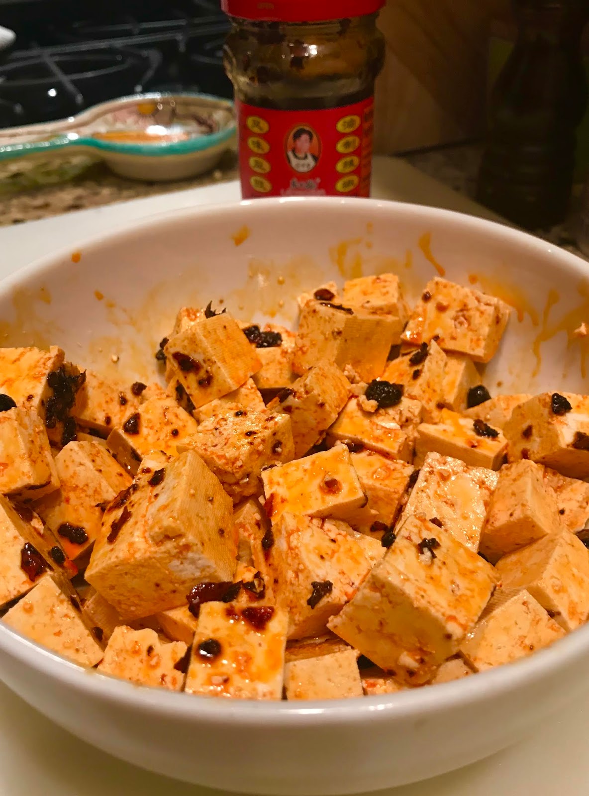 Add the Shaoxing wine and 1 Tbsp of LGM black bean paste to the cubed tofu to marinade. I’ve left it for up to an hour in the refrigerator and it imparts a nice flavor.