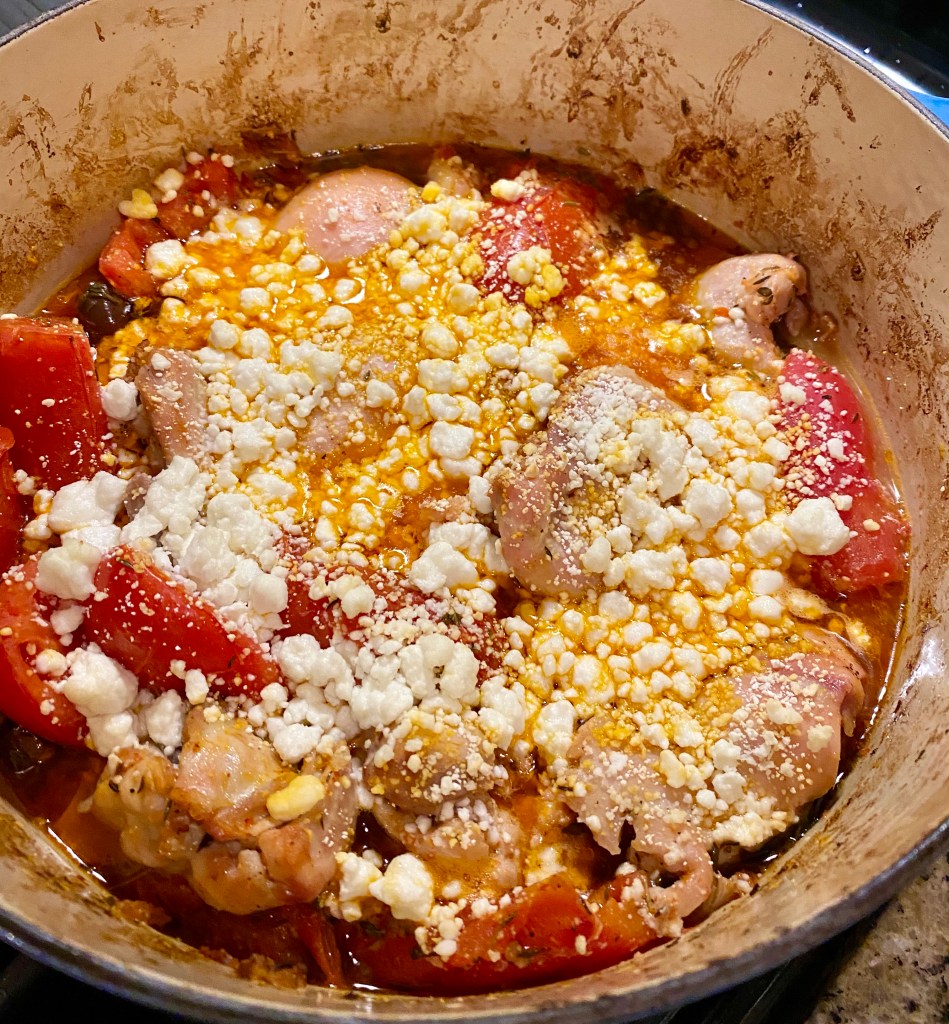 Preheat oven to 425F. Place the tomatoes in one layer into the bottom of an oven safe pan (I used a Le Cruset) and arrange the chicken on top. Baste the chicken with the remaining sauce and into the oven uncovered for 40-50 minutes. If you decide to use the cheese, just add it for the last 10 minutes.