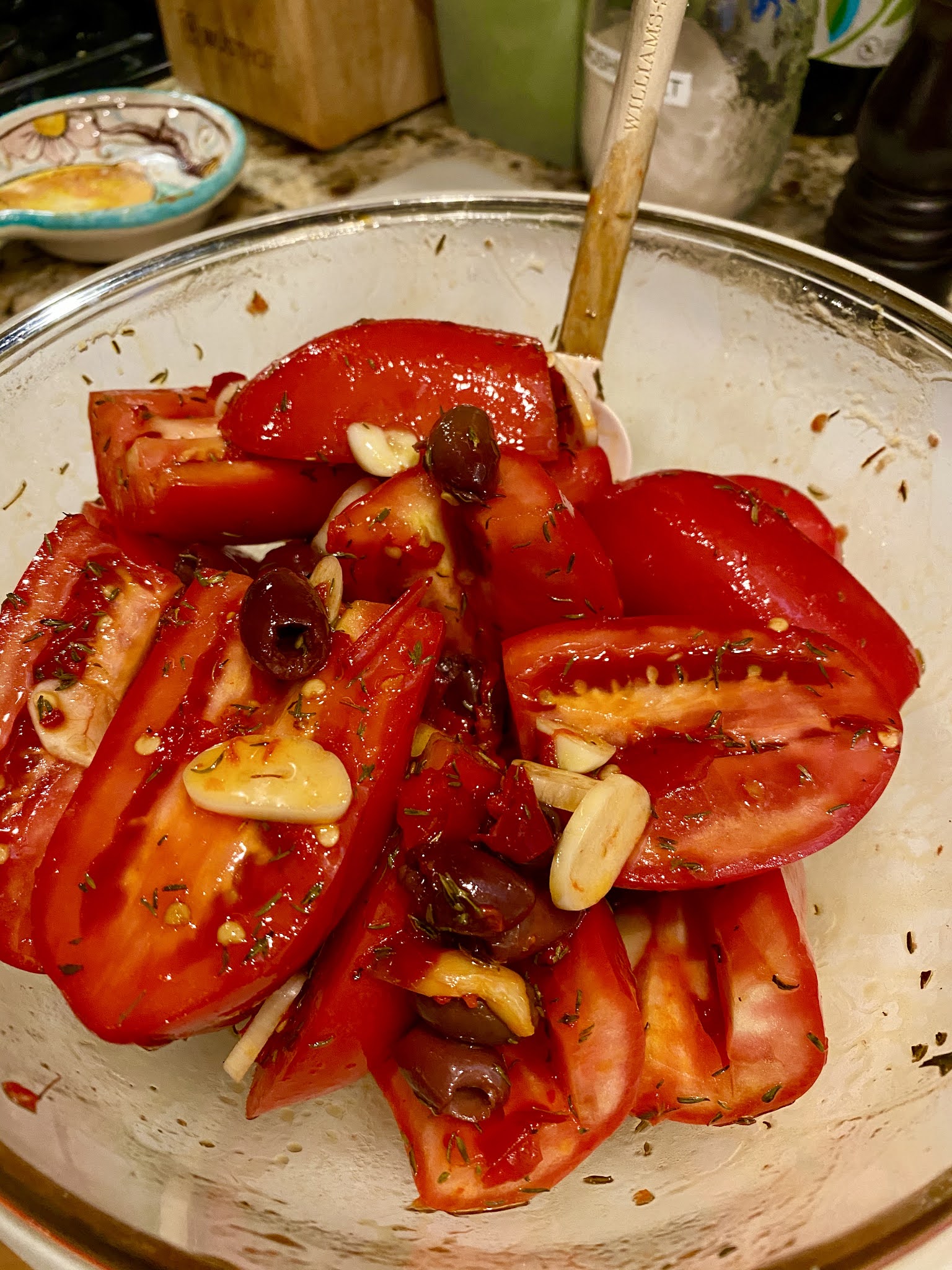 Prepare your tomatoes and then add all ingredients and toss well and let the mixture marinade on the counter.