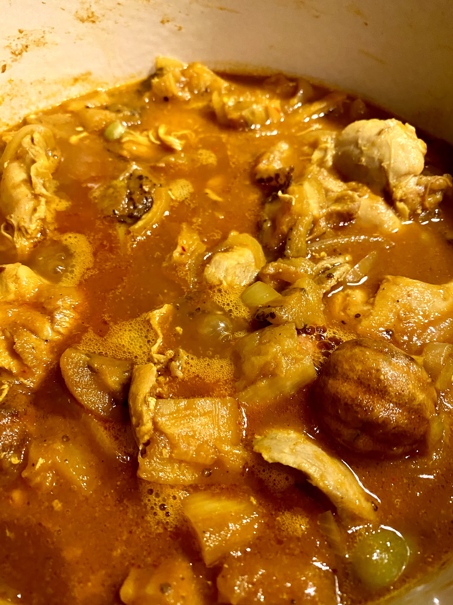 In sauté pan, heat olive oil and brown chicken thighs. Remove from pan and add sliced onions and garlic and sauté until browned. Add tomato paste and cook further, add vegetable broth and turmeric and cook until a sauce is formed. Loosely chop the eggplant and add to the dish.