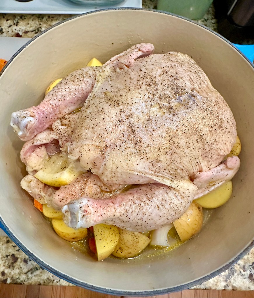 Sometimes the simplest recipes can be the best. A roasted chicken on a bed of vegetables is a miraculous thing. It’s a common French country dish and yields a moist and tender crispy chicken.