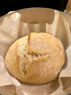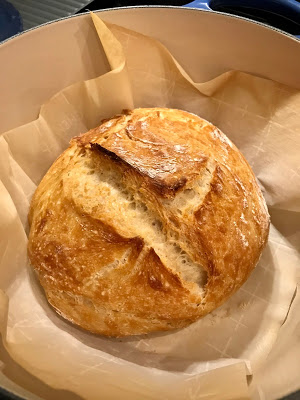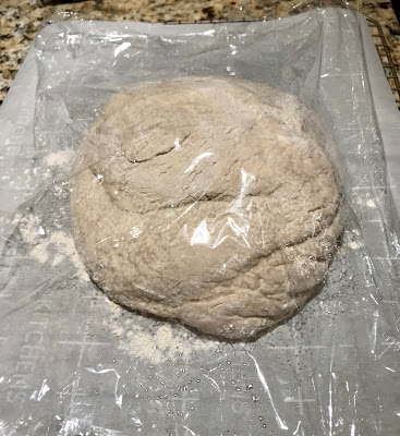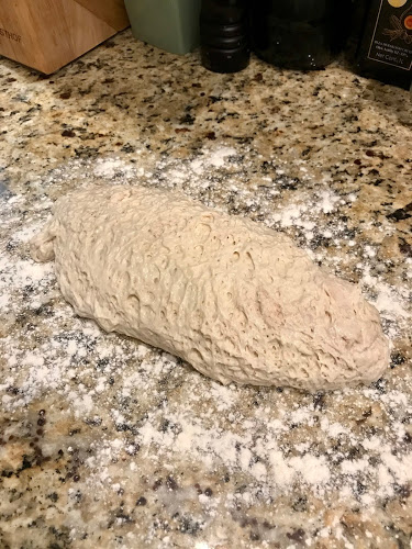 Preheat the oven to 450˚, with the enamel pot inside, and with the lid on. While the oven is heating, turn the dough out onto a well floured surface. The dough will be very sticky and stringy.