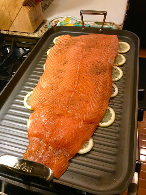 Salt and pepper both sides of the salmon filet. Lay on a bed of sliced lemons. Spoon over the glaze and brush it on.
